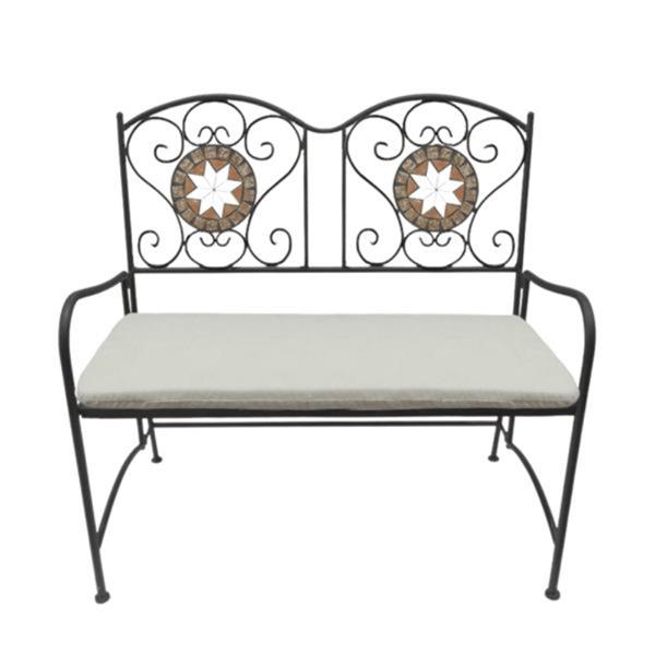 The comfortable Corsica Mosaic Bench, is a beautifully crafted seating option that combines elegance enhancing any incidental walls or corners in your outdoor living space. Featuring an intricate mosaic backrest in terracotta, cream, and grey tones, this bench adds a Mediterranean charm to any garden, outdoor seating space, patio, or courtyard. Designed with a sturdy wrought-iron frame, it ensures durability for outdoor use, while the 5cm cushioned seat provides added comfort for relaxing in the sun. Whether using it as a statement piece or part of a matching set, this bench blends decorative appeal with practicality.