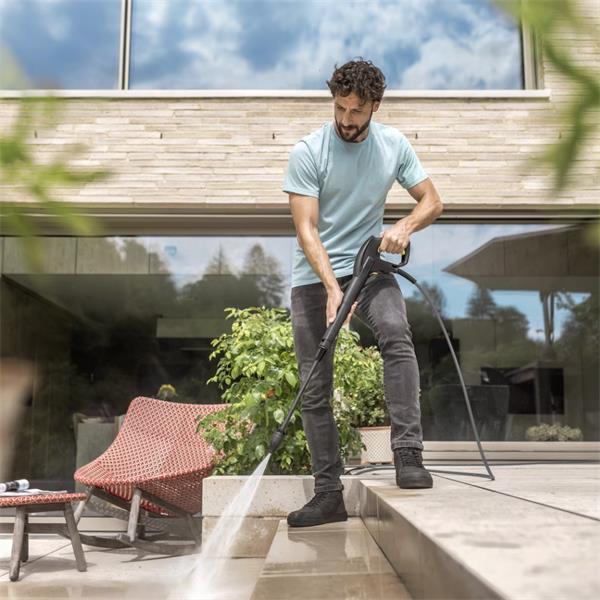 With the K 7 Power Flex pressure washer, every surface can be cleaned at the right pressure. The application consultant integrated into the Kärcher Home & Garden app helps the user to find the right pressure by providing practical tips on every cleaning situation and cleaning task – for perfect cleaning results. The K 7 Power Flex is fitted with a water-cooled motor, and has been designed for frequent cleaning as well as for tackling heavy dirt that often builds up on paths, swimming pools, bicycles or large cars, for example. The extensive range of equipment includes a trigger gun with a practical Quick Connect adapter via a PremiumFlex high-pressure hose, a reliable water filter that protects the pump, a Vario Power spray lance (VPS) and a Dirt Blaster with a rotating spot jet. The pressure setting on the VPS can be adjusted with a simple twisting motion, and the Dirt Blaster makes short work of even the most stubborn dirt. Other equipment details include the Plug 'n' Clean detergent system, the aluminium telescopic handle and the parking position for readily accessible accessories.