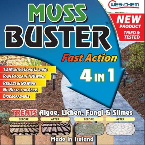 Wes-Chems Moss Buster fast action 4 in 1. Kills Moss, Algae, Lichen & Fungi. Moss Buster is rainproof in 180 minutes, lasts for 12 months and you can see results in 90 minutes. Moss buster contains no bleach or acids and is biodegradable.