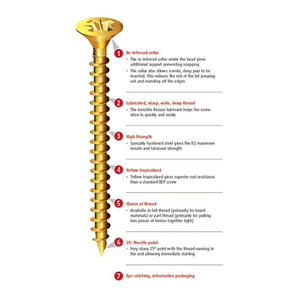 Presented in attractive, informative packaging the R2 Woodscrew sets the standard for the Consistency of Quality and performance of all Reisser products. "