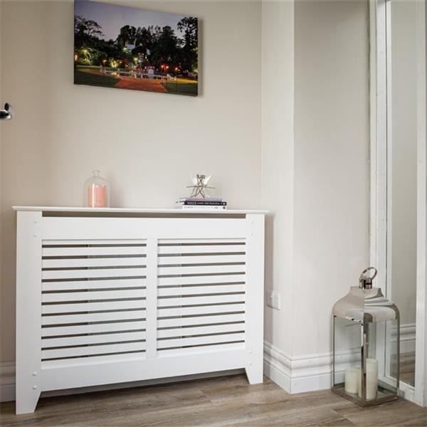 Pre-finished white contemporary style Radiator Cover. Slatted grill removes for easy access to radiator valves. Easy click assembly with wall fixings included.